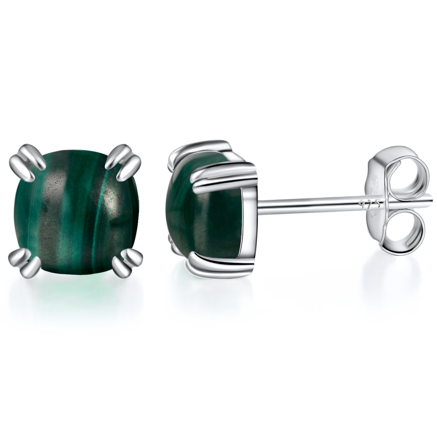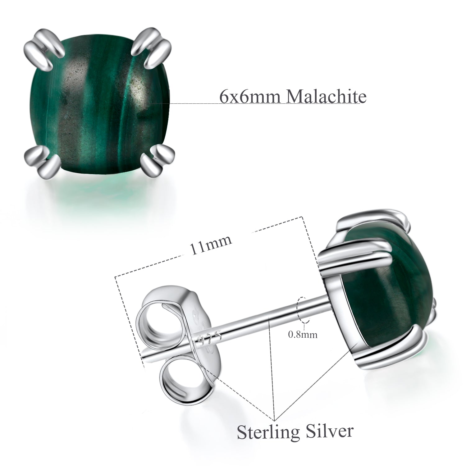 TIKJE Gemstone 925 Sterling Silver Earrings White Gold Plated Malachite 6mm Square Earrings Women's 1 Pair (Nickel Free)